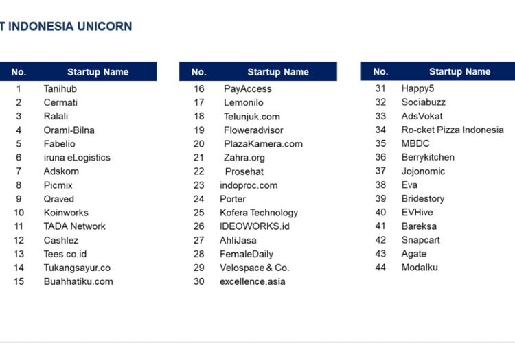 Daftar 44 startup lokal asal Indonesia yang ditargetkan pemerintah menjadi unicorn bisa dilihat di tabel di bawah ini.